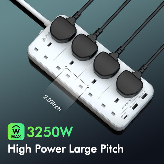 AUNNO Extension Lead with USB Slots, 4 Way Sockets Outlets with 4 USB-C Ports and 2 USB Ports, 1.8M Extension Cable with Switch Surge Protected Power Strips, UK Multi Plug Adapter Electrical Cords